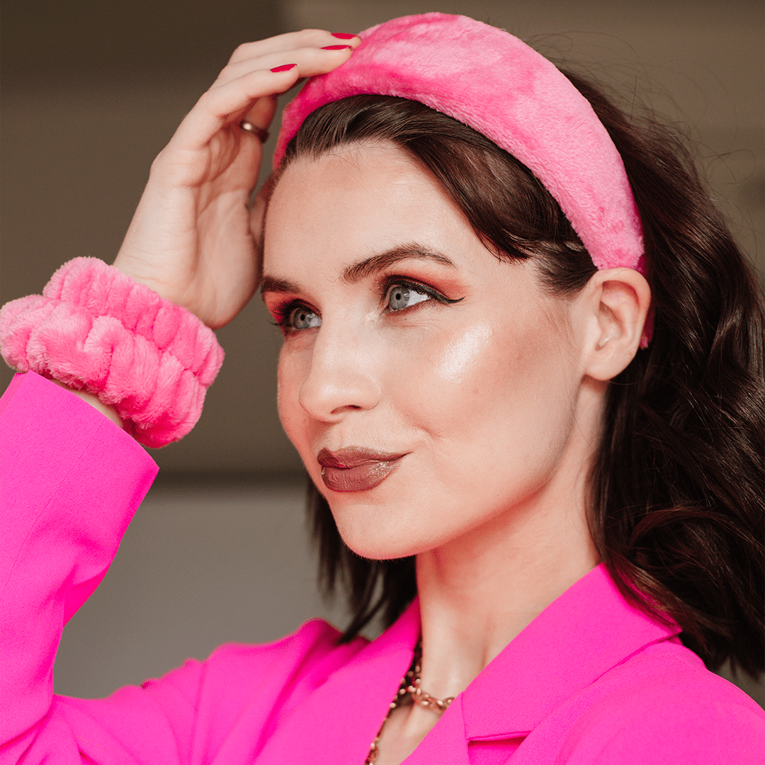 Wristbands are ultra-absorbent & designed to stop the flow of water down your arms as you do your AM/PM skincare routine. No more wet counters, no more wet sleeves! Fluffy headband keeps hair pulled back & out of your face.