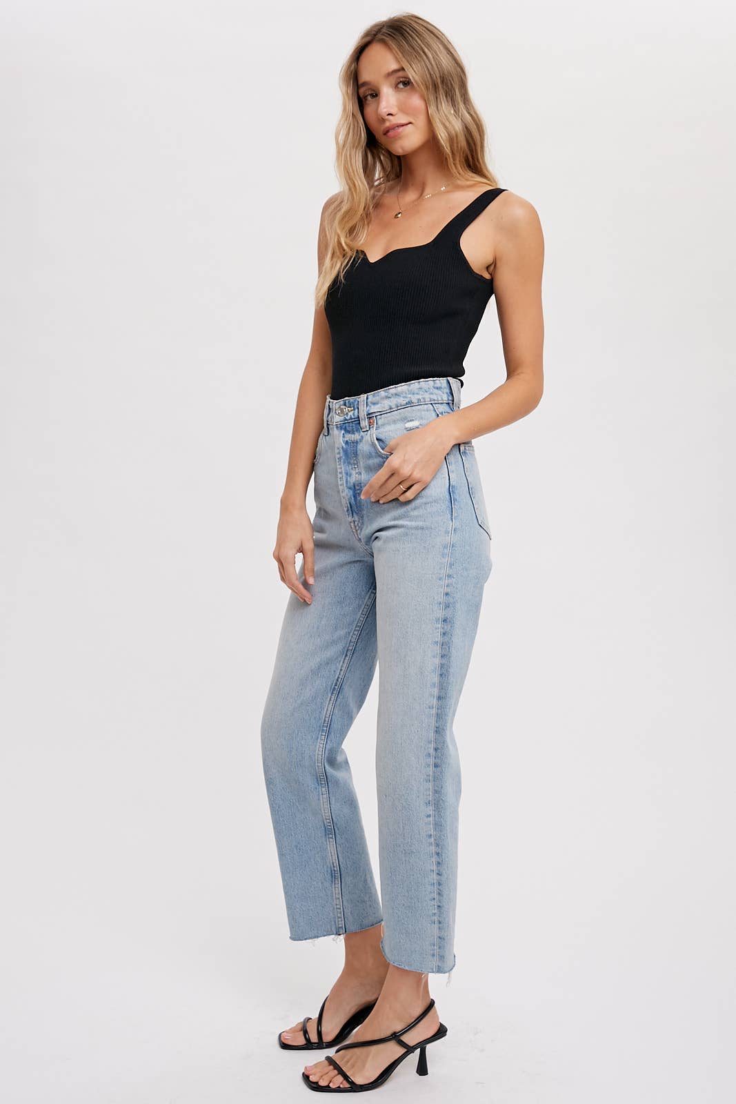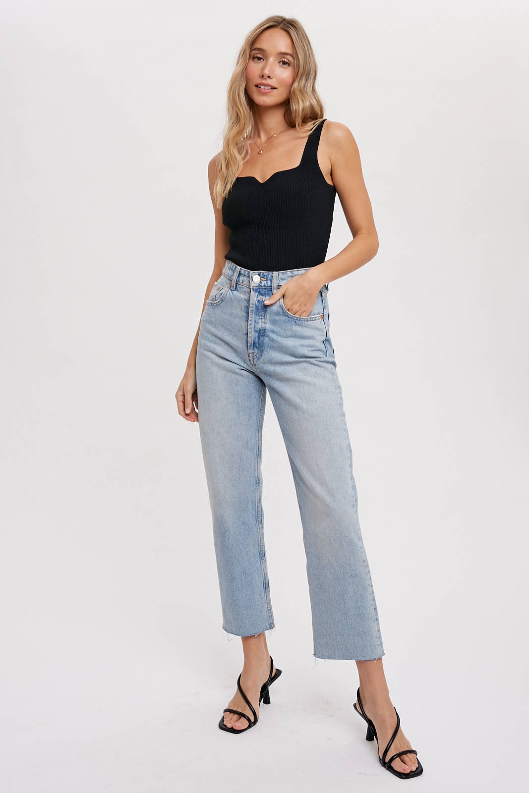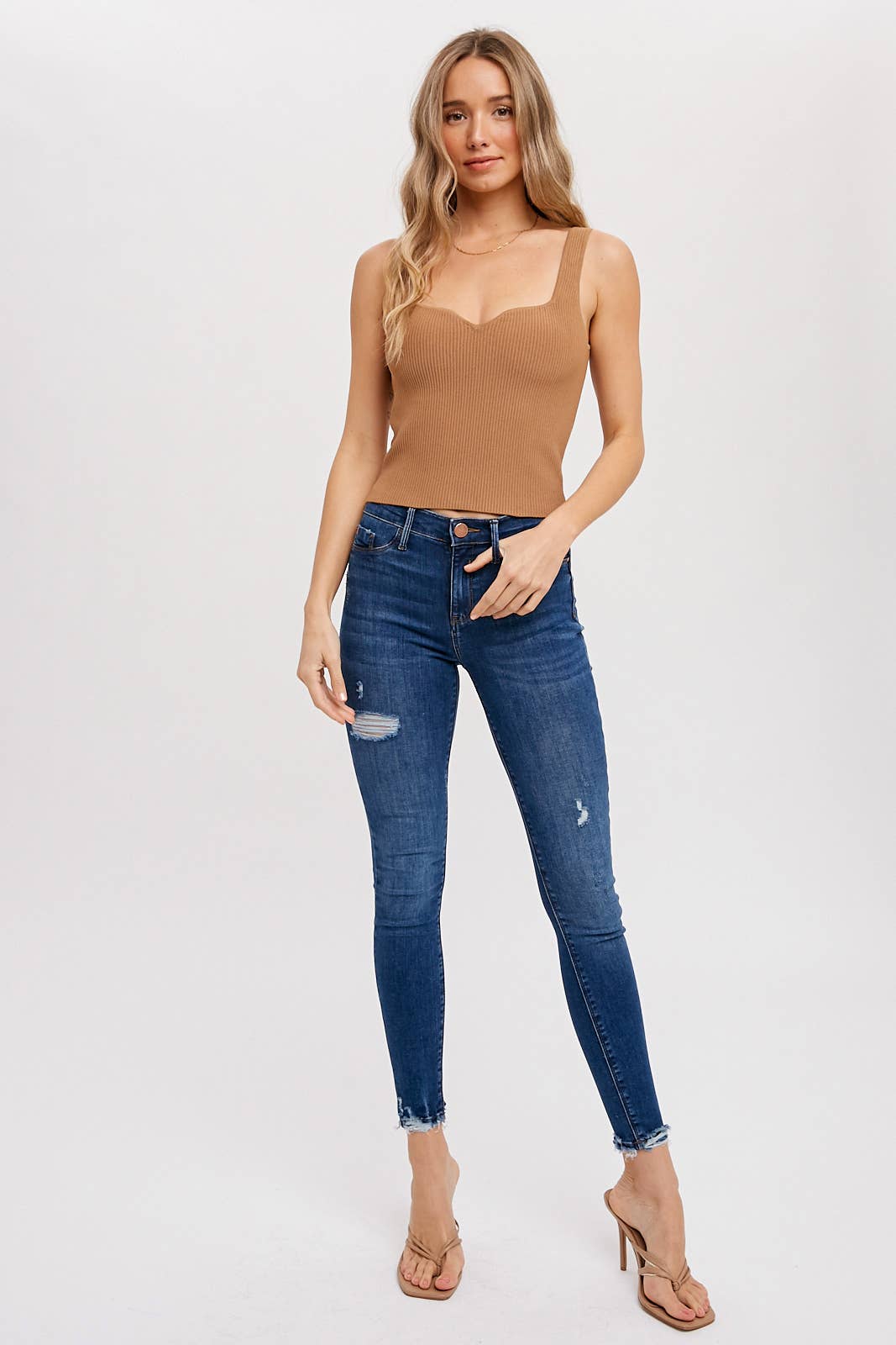 Basic essential tank featuring a ribbed stretch yarn, sweatheart neckline, structured and textural feel, fitted silhouette.