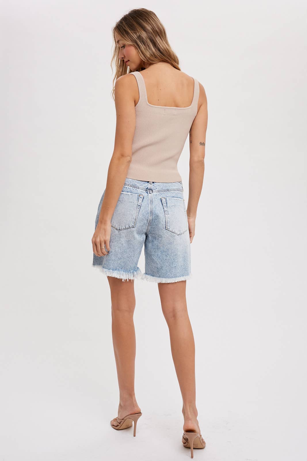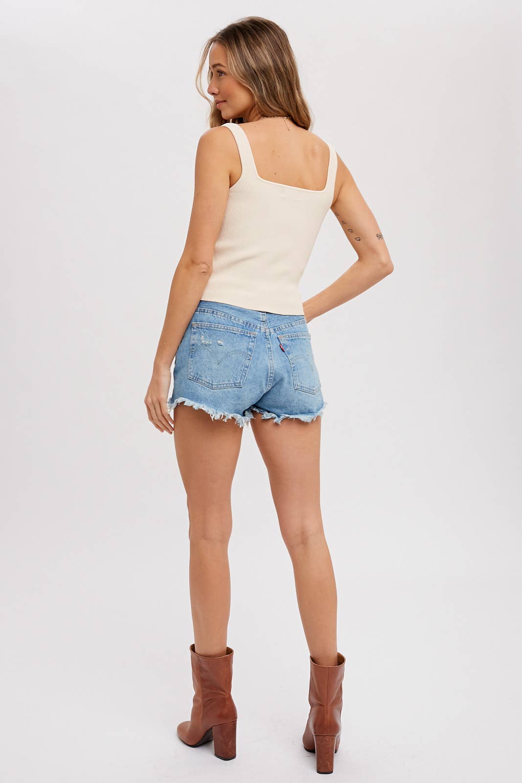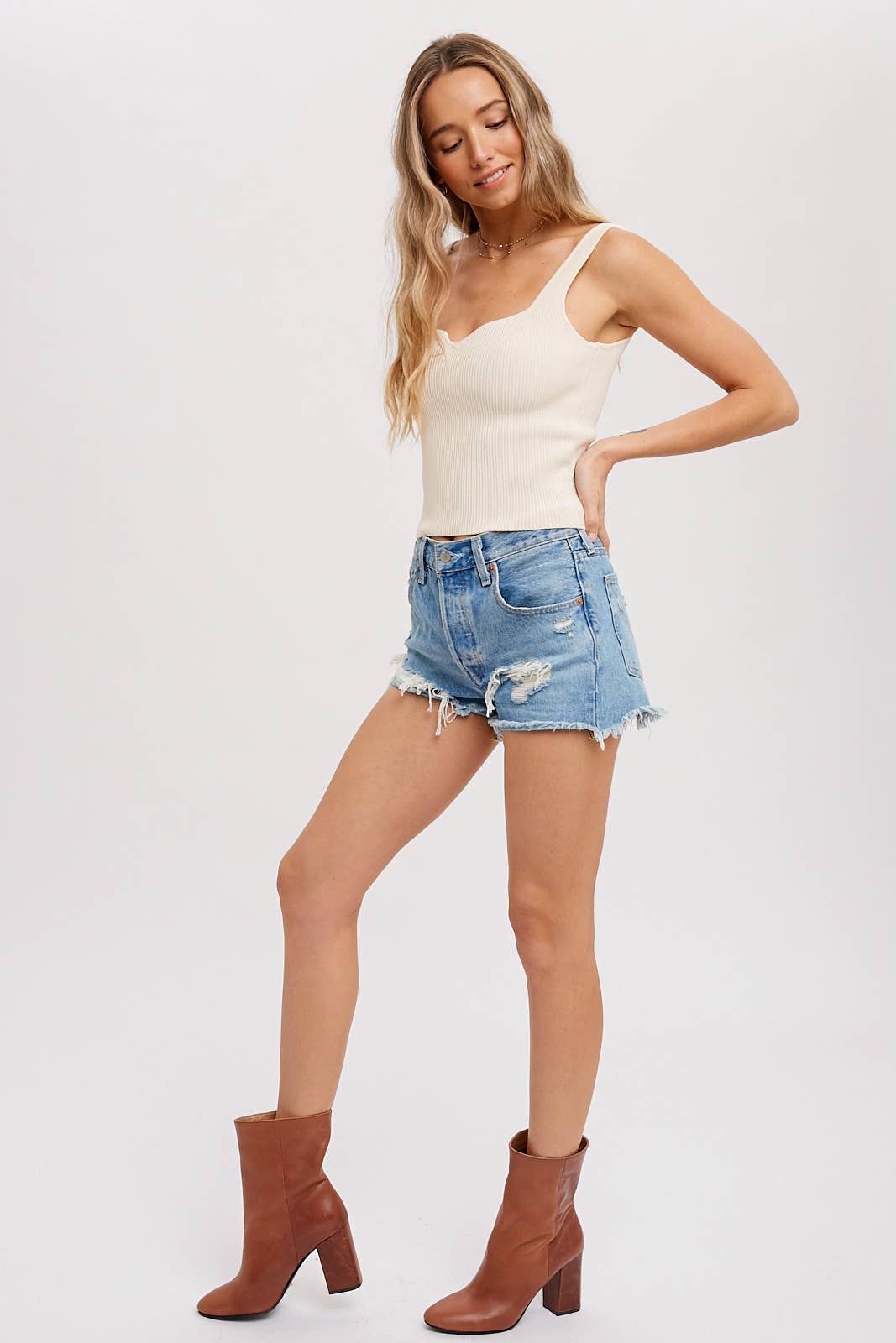 Basic essential tank featuring a ribbed stretch yarn, sweatheart neckline, structured and textural feel, fitted silhouette.