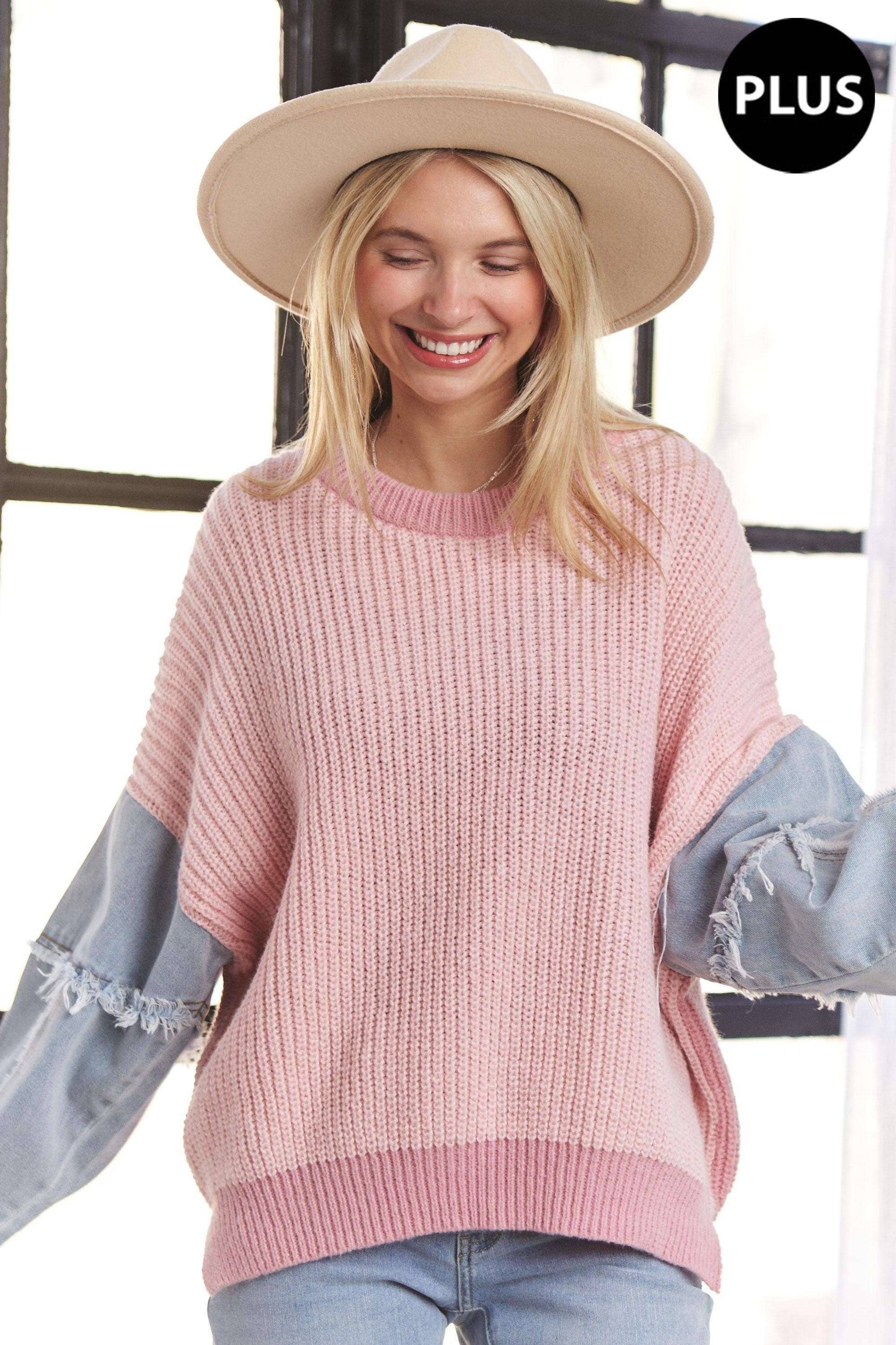 PLUS SIZE COLORBLOCK SWEATER TOP WITH FRAYED DENIM SLEEVE