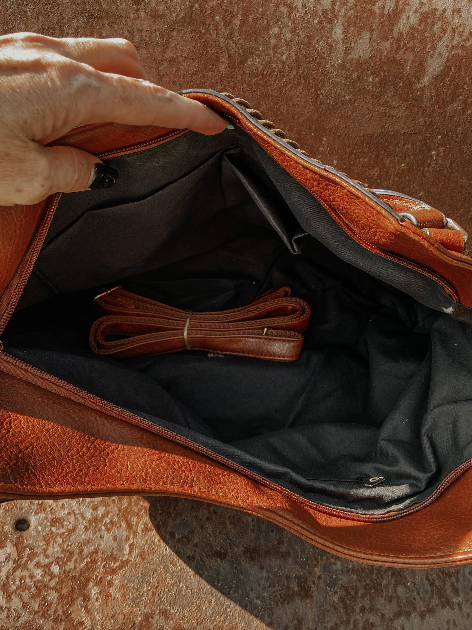 This Leather purse has chic cross stitched detail and lots of room to store everything you need. It's complete with an inside zipper pocket, 2 side pockets, zipper pocket on the backside and an adjustable detachable strap. This bag measures 11 inches by 18 inches by 5 1/2 inches, zipper closure ensuring every item inside is kept safe and secure.