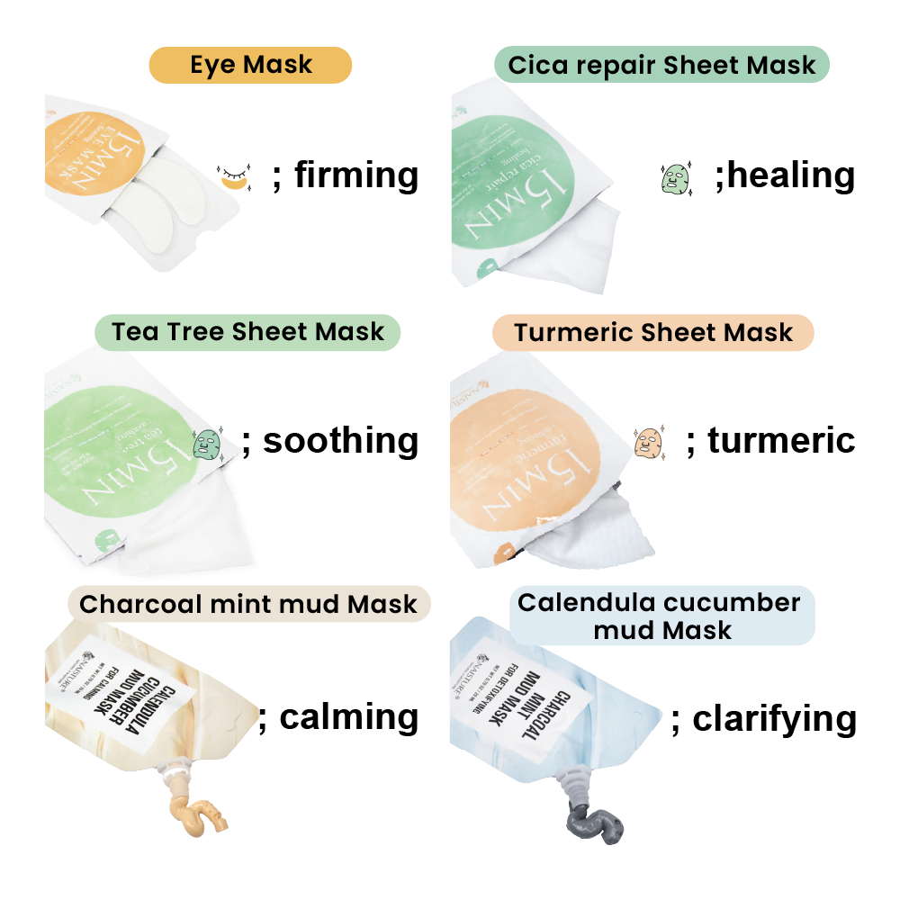 * 15 MIN FACE MAKES (X3) Cica Repair Sheet Mask(x1)-Healing & Moisturizing. Cica and Aloe Extract help with skin renewal, making the mask both revitalizing and healing. Turmeric Sheet Mask (x1)-Moisturizing. Turmeric contains antioxidants to reduce skin inflammation and redness. Tea Tree Sheet Mask(x1)-Soothing & Moisturizing. Tea tree and Licorice work to calm and soothe irritated skin.