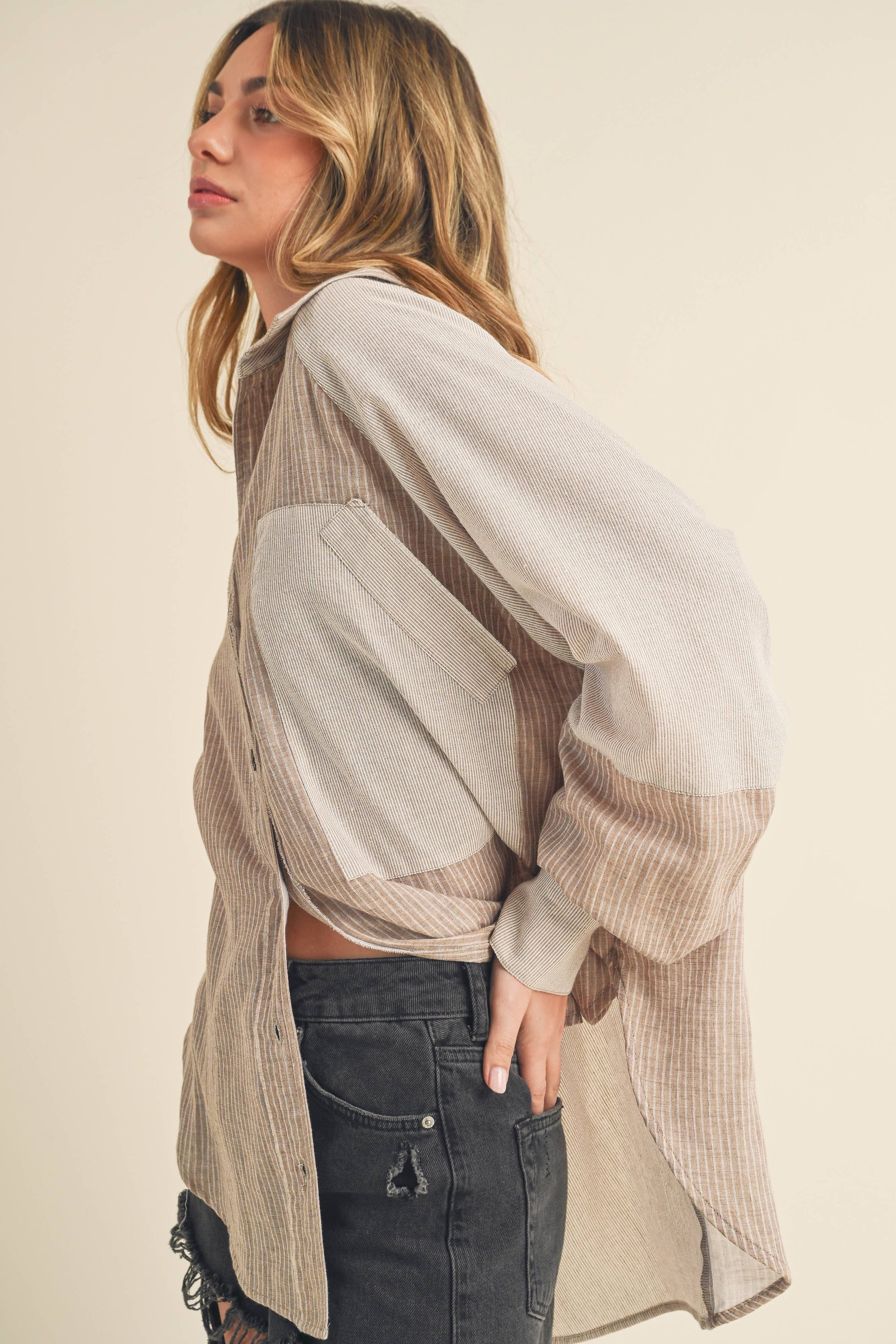 the Shia button-down is a stylish variation of the classic button-up shirt, featuring panels or sections of different fabrics or textures strategically placed for a unique and eye-catching design.