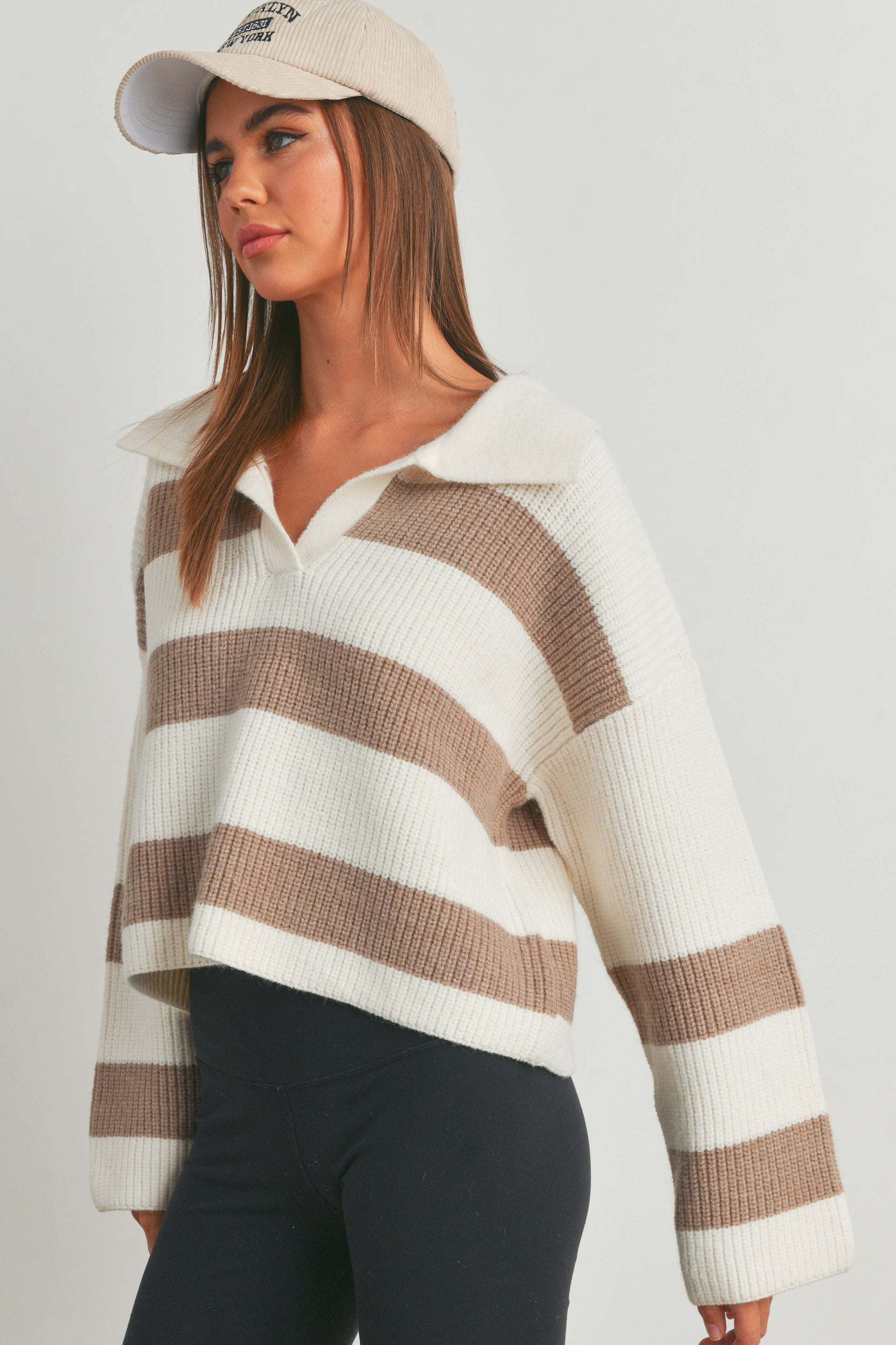 Stripe Drop Shoulder with Wide Collar Sweater - a perfect blend of comfort and style! This trendy sweater features eye-catching stripes and a chic wide collar, making a bold statement effortlessly.