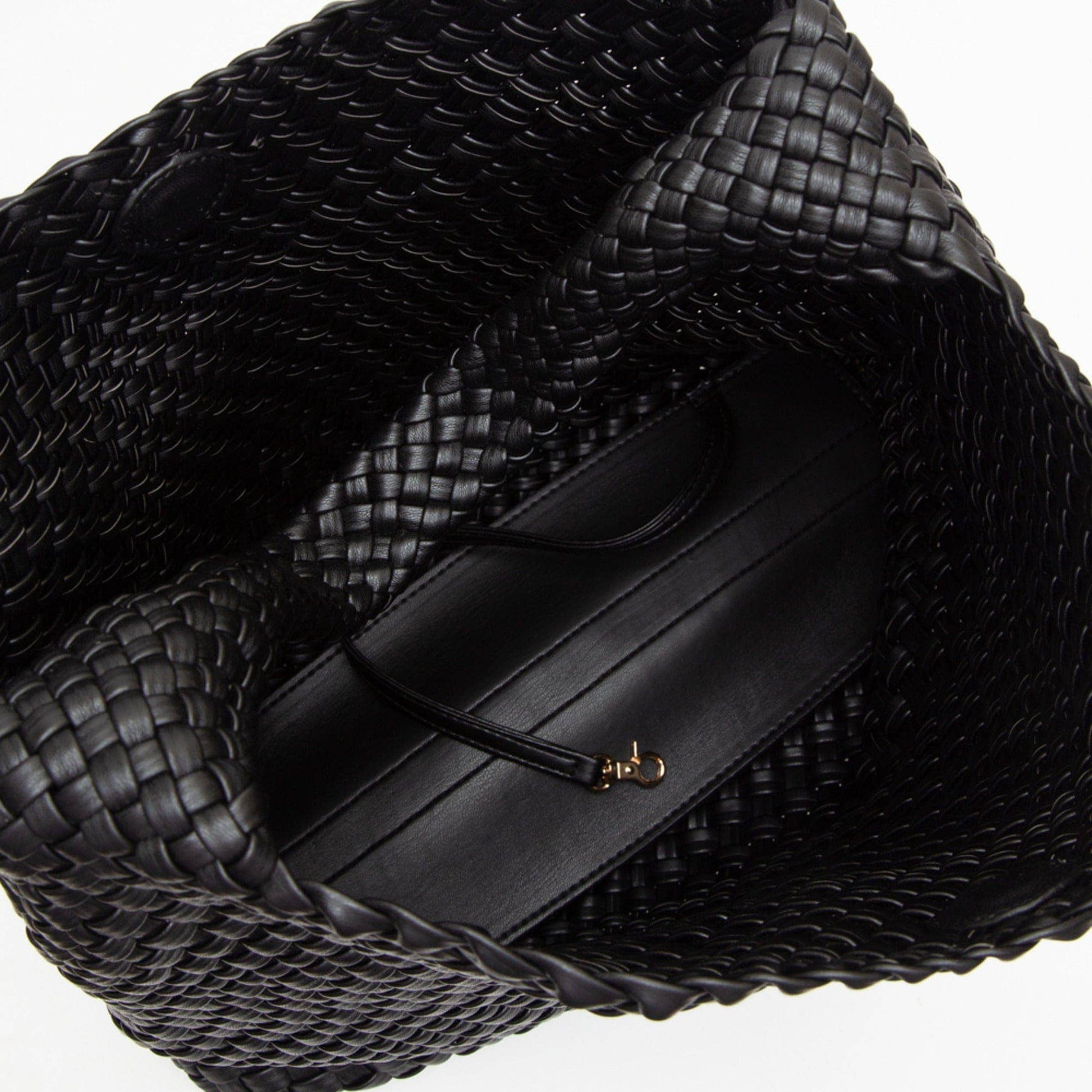 Carry all your essentials with ease (and style) with the Tiara Woven Hobo Tote Bag. The included pouch adds extra organization and versatility. * Magnetic closure * Includes pouch with removable wristlet strap and inside slip and zip pocket * Gold hardware * 14" x 5" x 12"